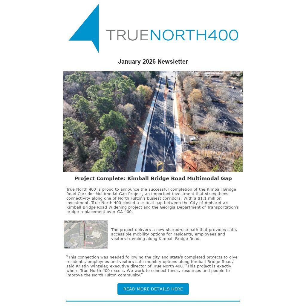 “This connection was needed following the city and state’s completed projects to give residents, employees and visitors safe mobility options along Kimball Bridge Road,” said Kristin Winzeler, executive director of True North 400. “This project is exactly where True North 400 excels. We work to connect funds, resources and people to improve the North Fulton community.”