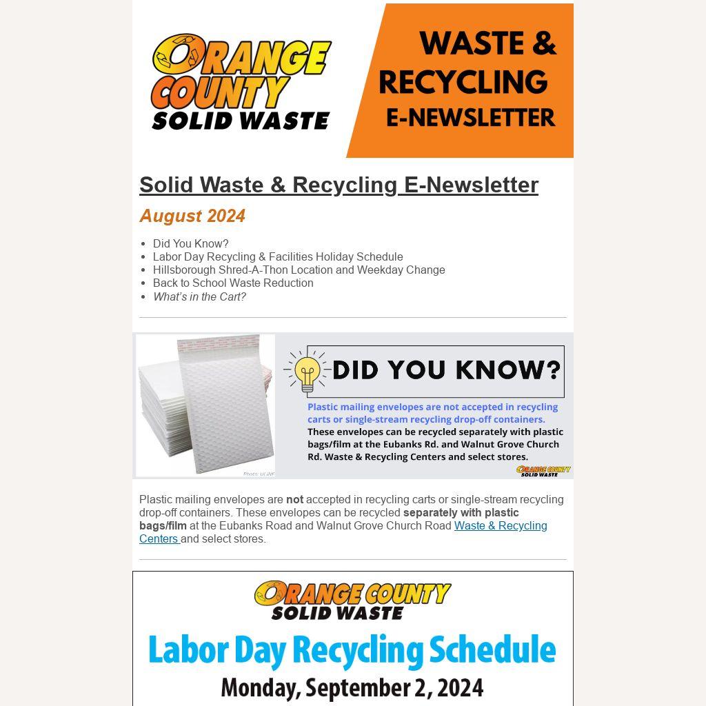 Curbside recycling will not be collected on Monday, September 2. Curbside recycling collection will be delayed by one day this week. For instance, if your recycling is typically collected on Monday, it will instead be collected on Tuesday. The Solid Waste Administrative Office, Orange County Landfill, and Waste and Recycling Centers will be closed on Monday, September 2.