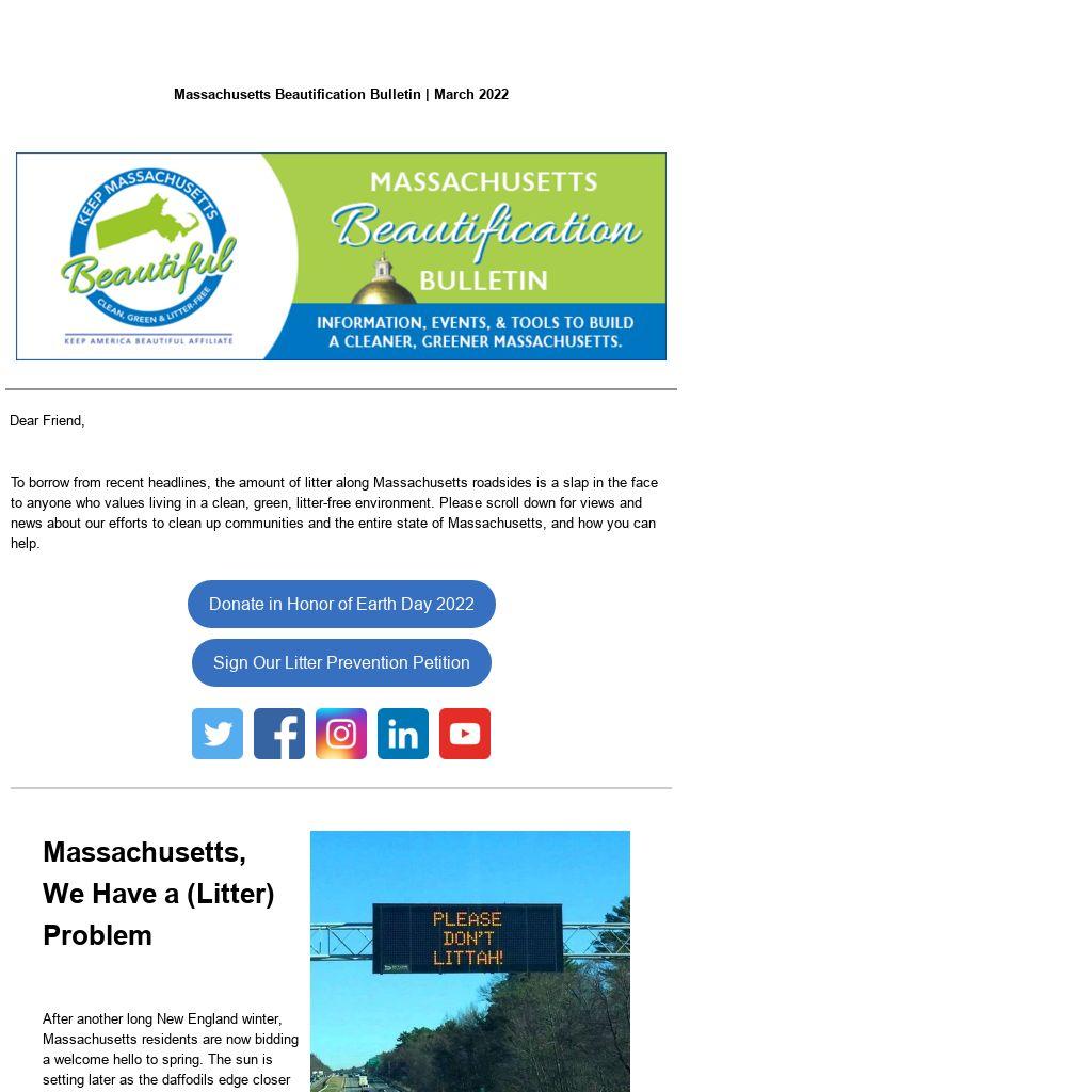 - Urge our state leaders to launch a Litter Prevention & Cleanup Task Force by signing our petition at www.change.org/litterfreemass.