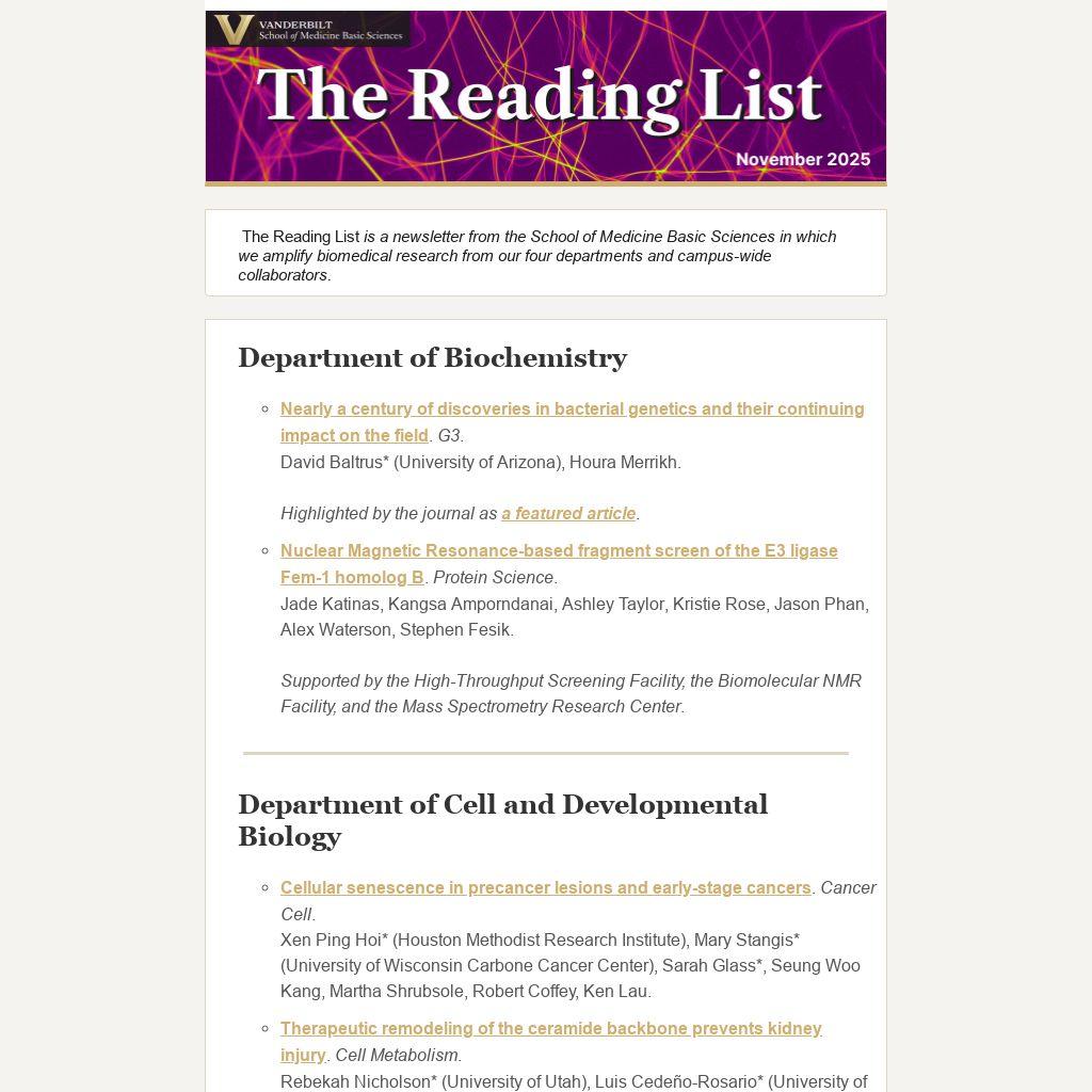 The Reading List is a newsletter from the School of Medicine Basic Sciences in which we amplify biomedical research from our four departments and campus-wide collaborators.