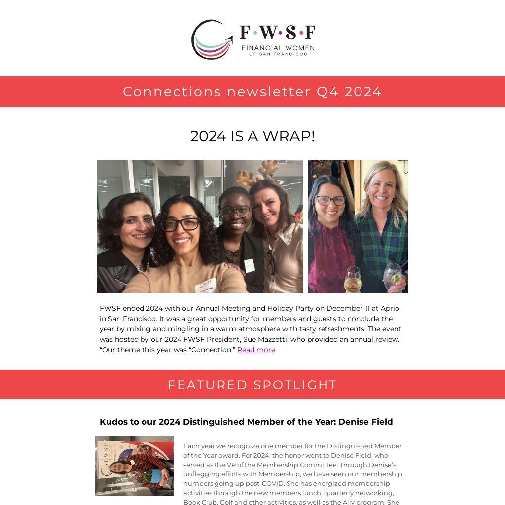 FWSF ended 2024 with our Annual Meeting and Holiday Party on December 11 at Aprio in San Francisco. It was a great opportunity for members and guests to conclude the year by mixing and mingling in a warm atmosphere with tasty refreshments. The event was hosted by our 2024 FWSF President, Sue Mazzetti, who provided an annual review. “Our theme this year was “Connection.” Read more
