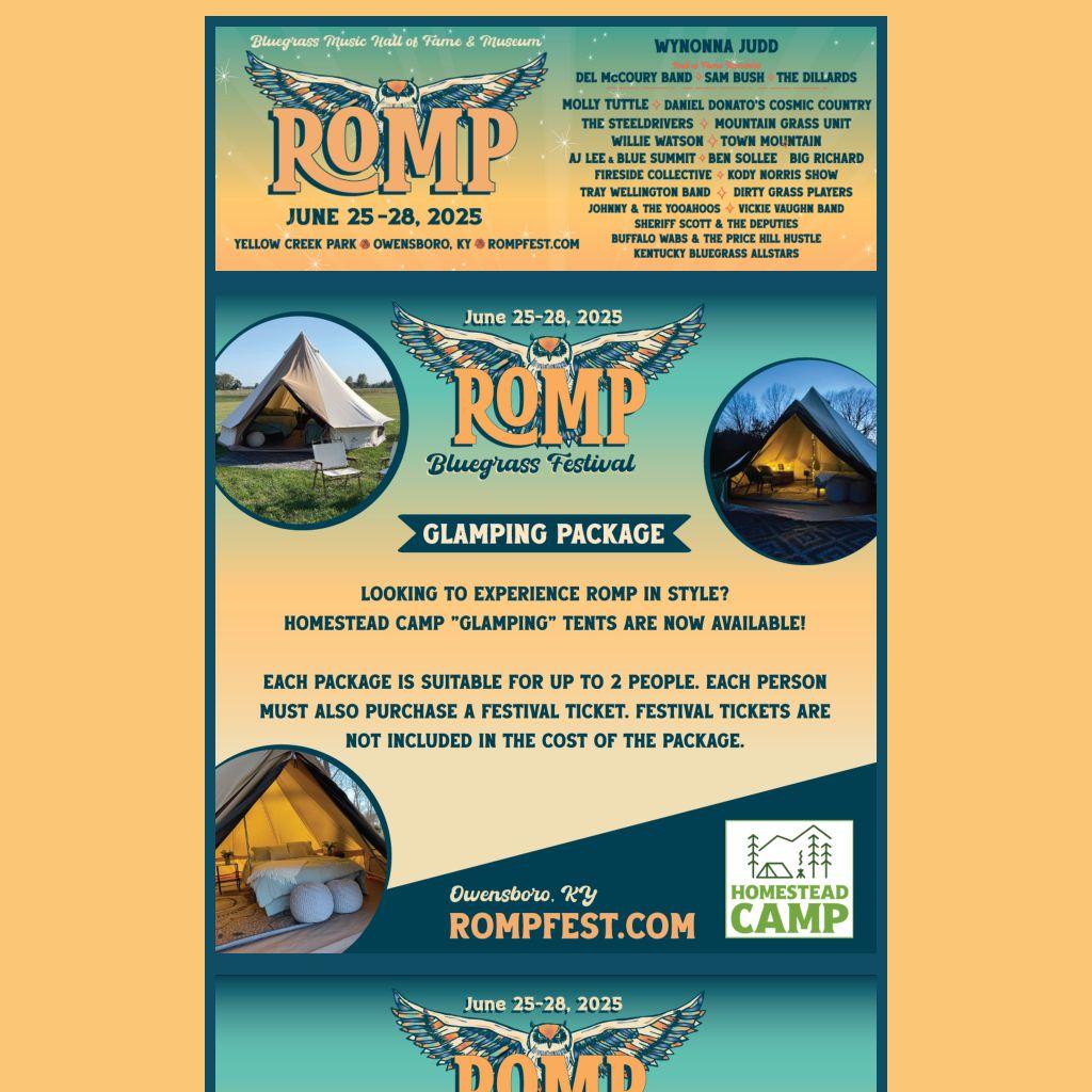 We’ve teamed up with Homestead Camp to offer the ultimate luxury tent camping experience! Our Glamping Packages are designed for up to 2 people and come with everything you need to make your ROMP adventure unforgettable.