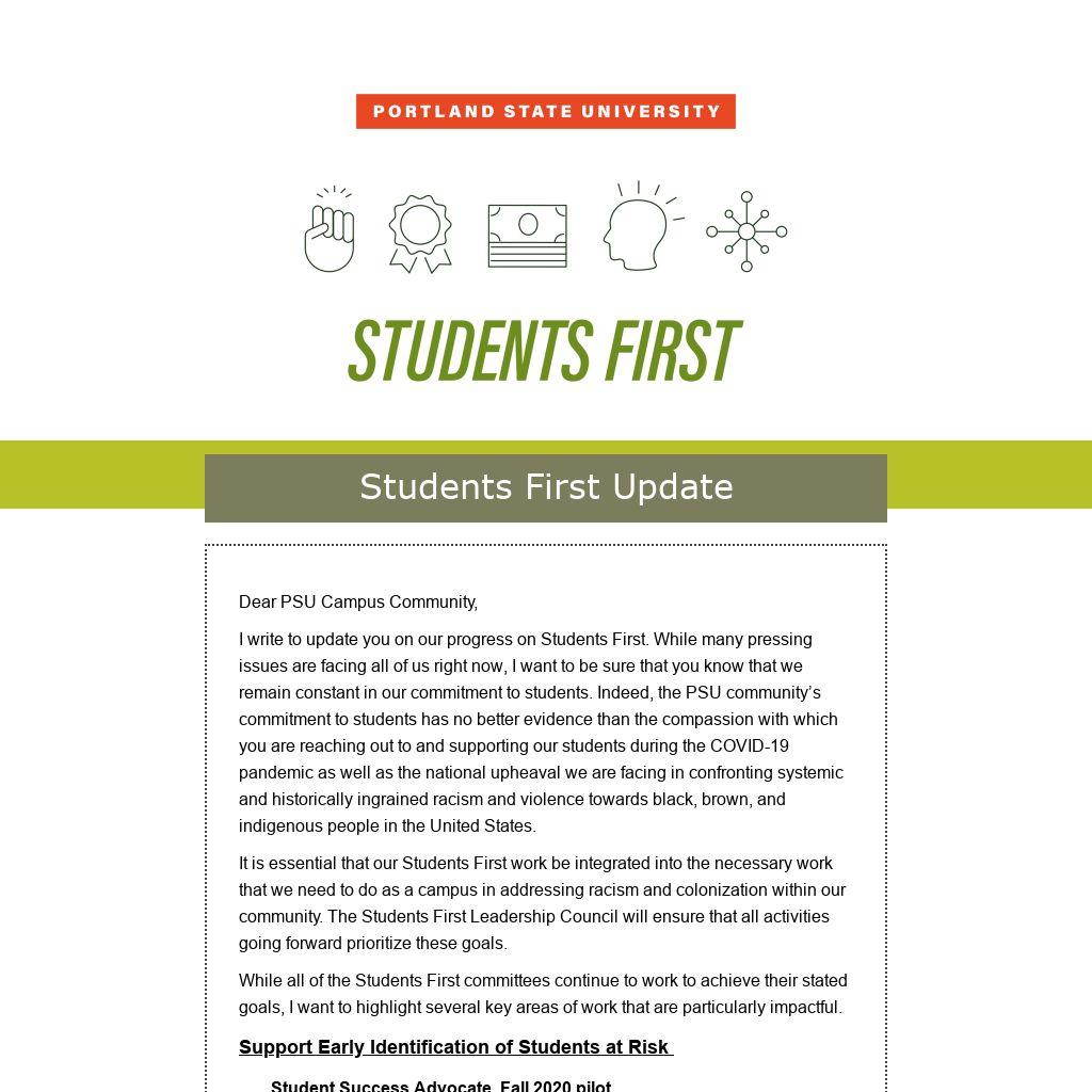 I write to update you on our progress on Students First. While many pressing issues are facing all of us right now, I want to be sure that you know that we remain constant in our commitment to students. Indeed, the PSU community’s commitment to students has no better evidence than the compassion with which you are reaching out to and supporting our students during the COVID-19 pandemic as well as the national upheaval we are facing in confronting systemic and historically ingrained racism and violence towards black, brown, and indigenous people in the United States.