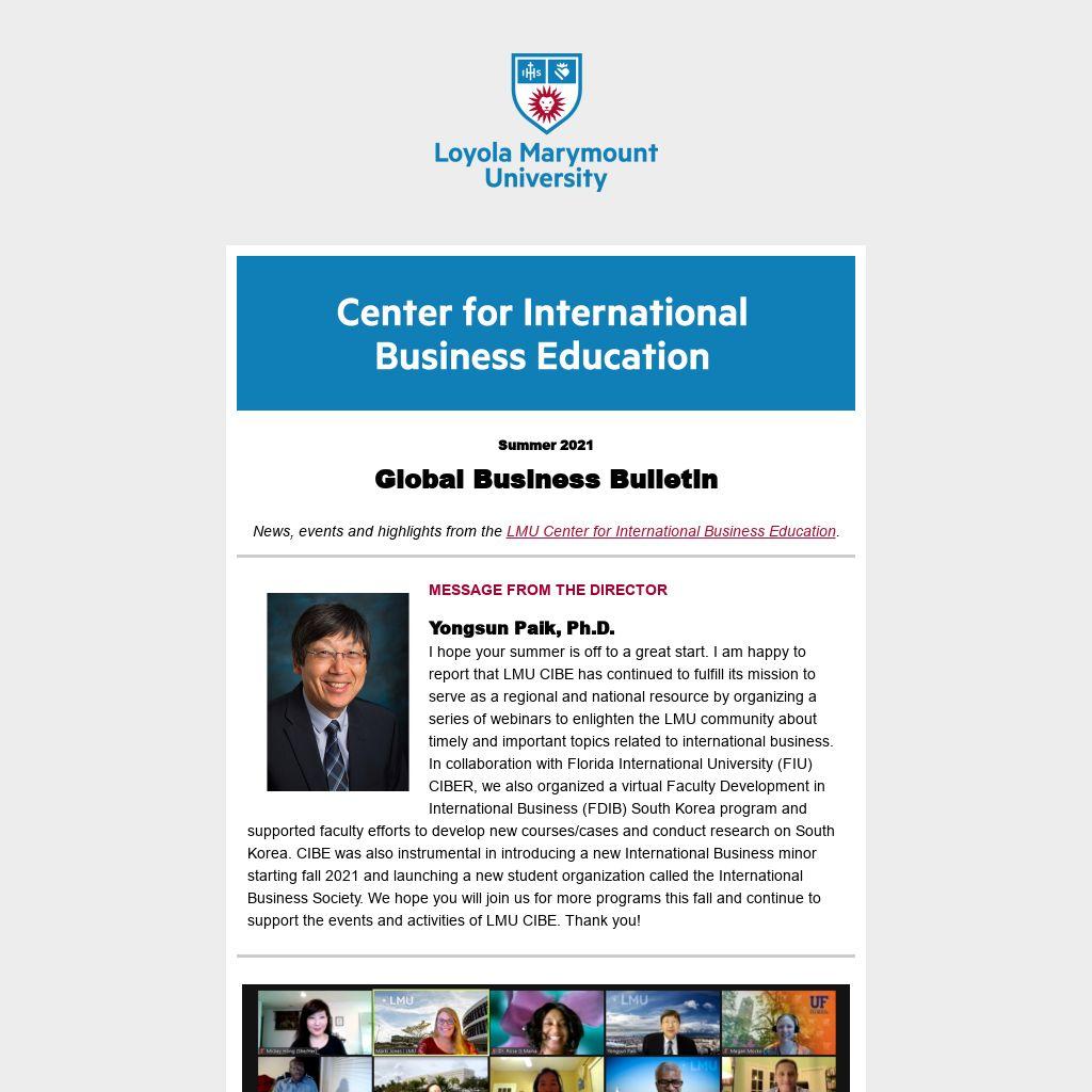 Yongsun Paik, Ph.D.I hope your summer is off to a great start. I am happy to report that LMU CIBE has continued to fulfill its mission to serve as a regional and national resource by organizing a series of webinars to enlighten the LMU community about timely and important topics related to international business. In collaboration with Florida International University (FIU) CIBER, we also organized a virtual Faculty Development in International Business (FDIB) South Korea program and supported faculty efforts to develop new courses/cases and conduct research on South Korea. CIBE was also instrumental in introducing a new International Business minor starting fall 2021 and launching a new student organization called the International Business Society. We hope you will join us for more programs this fall and continue to support the events and activities of LMU CIBE. Thank you!