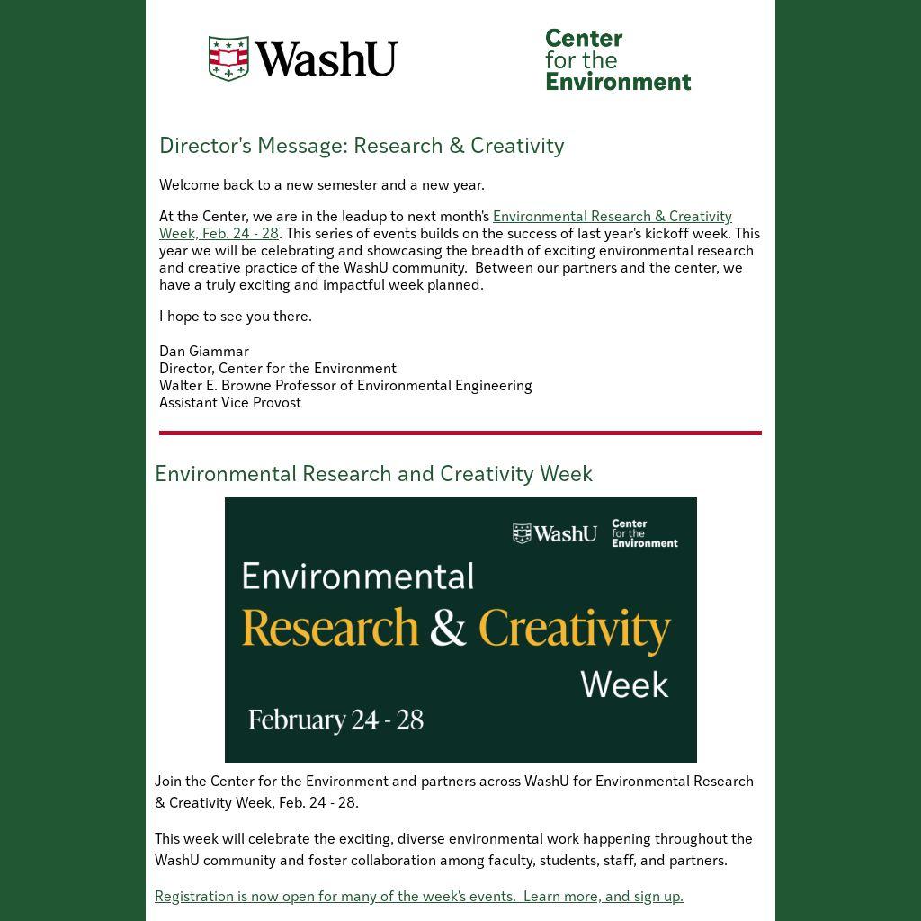 At the Center, we are in the leadup to next month's Environmental Research & Creativity Week, Feb. 24 - 28. This series of events builds on the success of last year's kickoff week. This year we will be celebrating and showcasing the breadth of exciting environmental research and creative practice of the WashU community. Between our partners and the center, we have a truly exciting and impactful week planned.