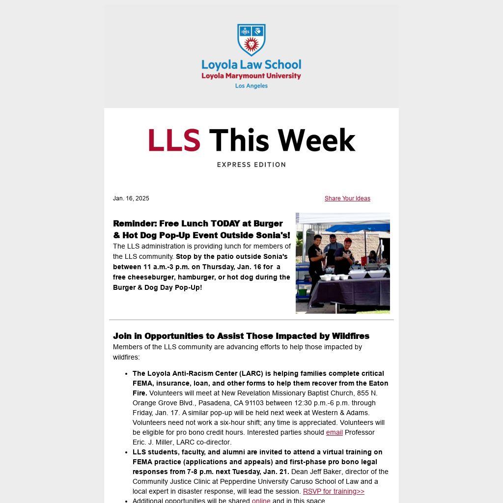 - The Loyola Anti-Racism Center (LARC) is helping families complete critical FEMA, insurance, loan, and other forms to help them recover from the Eaton Fire. Volunteers will meet at New Revelation Missionary Baptist Church, 855 N. Orange Grove Blvd., Pasadena, CA 91103 between 12:30 p.m.-6 p.m. through Friday, Jan. 17. A similar pop-up will be held next week at Western & Adams. Volunteers need not work a six-hour shift; any time is appreciated. Volunteers will be eligible for pro bono credit hours. Interested parties should email Professor Eric. J. Miller, LARC co-director.