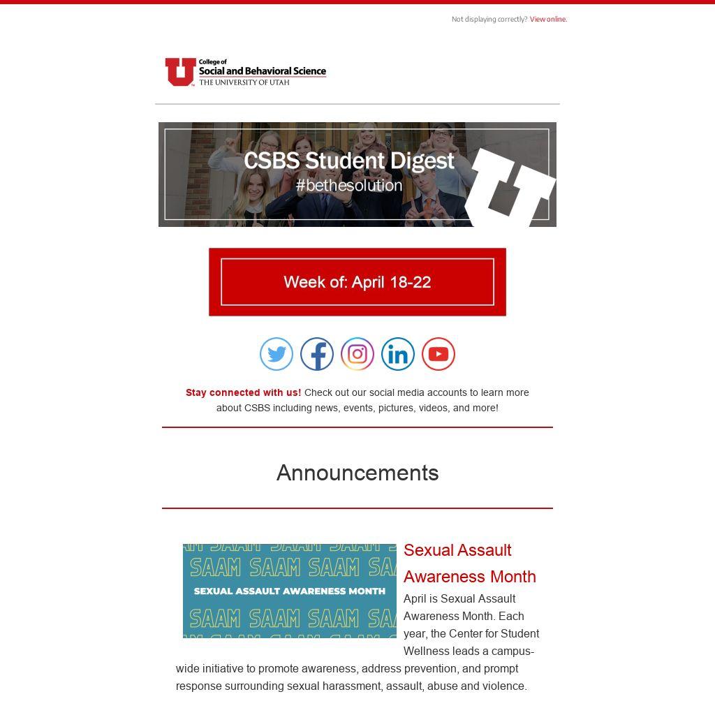 April is Sexual Assault Awareness Month. Each year, the Center for Student Wellness leads a campus-wide initiative to promote awareness, address prevention, and prompt response surrounding sexual harassment, assault, abuse and violence.