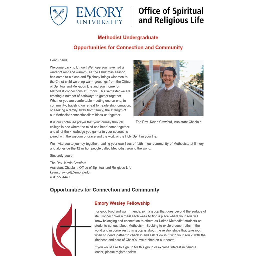 Welcome back to Emory! We hope you have had a winter of rest and warmth. As the Christmas season has come to a close and Epiphany brings wisemen to the Christ-child we bring warm greetings from the Office of Spiritual and Religious Life and your home for Methodist connections at Emory. This semester we are creating a number of pathways to gather together. Whether you are comfortable meeting one on one, in community, traveling on retreat for leadership formation, or seeking a family away from family, the strength of our Methodist connectionalism binds us together