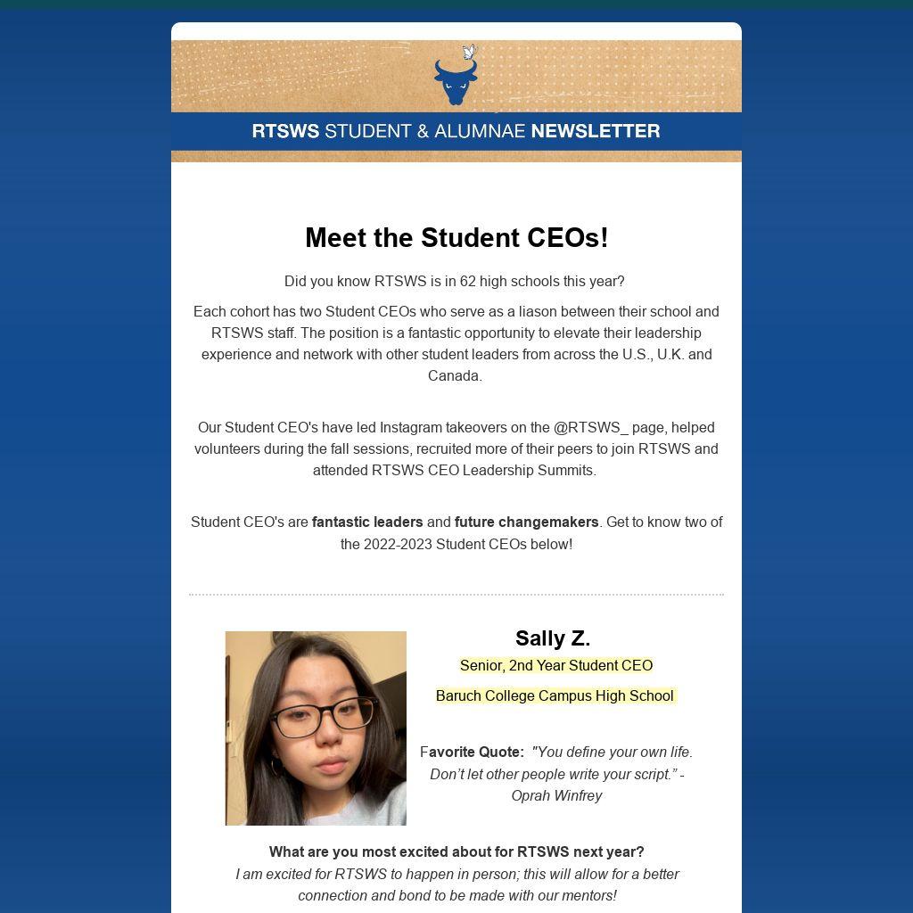 Before I had the opportunity to join RTSWS, most of my ideas about business and how to accomplish my goals were abstract. It felt like something I could only see in theory. Since my engagement with the program, my future plans feel far more realistic - being able to learn from and connect with women business leaders helps put our members in touch with real plans and real possibilities for themselves. It will be my mission to encourage students to join the group as a way to find their footing BEFORE planning for college. By demonstrating how they can play a role in successfully navigating their future, their independence and personal financial literacy, the message will be that RTSWS is designed to empower young women. Bringing in diverse student voices will lift all women on our individual paths to financial literacy and eventually in our careers. Joining RTSWS offers practical experience in things that were previously inaccessible, and any student who joins us will be offered this enormous benefit.