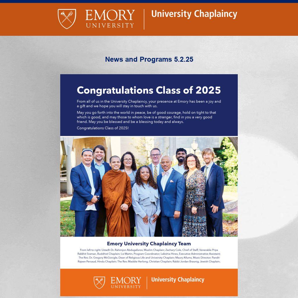 Emory University Chaplaincy ENews is published weekly during term publicizing Atlanta-campus spiritual life programs. It is not a comprehensive listing. For Oxford College spiritual life, please click here. To submit information or to update your preferences, please contact religiouslife@emory.edu.