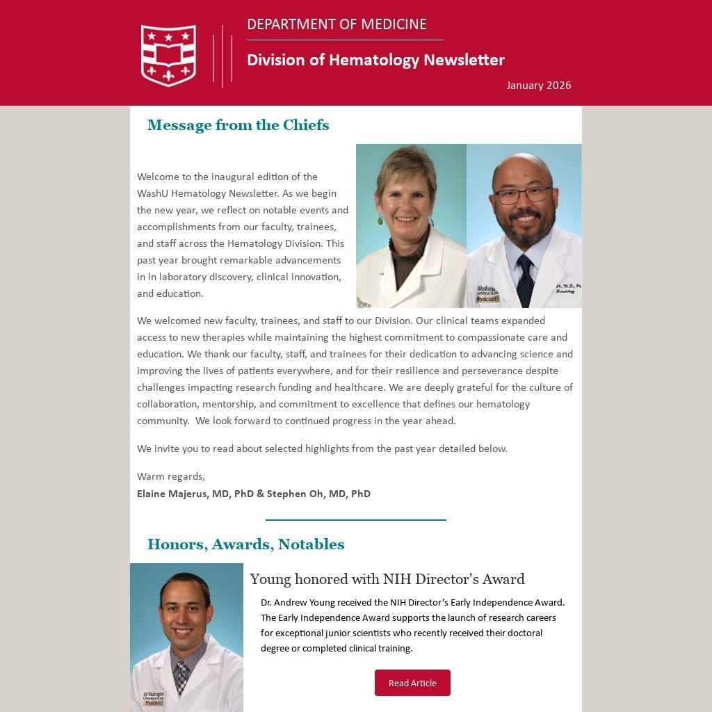 Welcome to the inaugural edition of the WashU Hematology Newsletter. As we begin the new year, we reflect on notable events and accomplishments from our faculty, trainees, and staff across the Hematology Division. This past year brought remarkable advancements in in laboratory discovery, clinical innovation, and education.