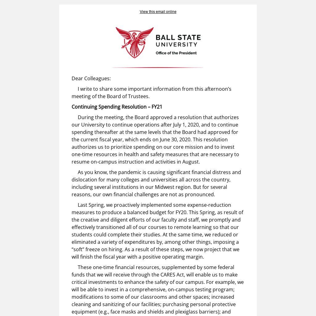 During the meeting, the Board approved a resolution that authorizes our University to continue operations after July 1, 2020, and to continue spending thereafter at the same levels that the Board had approved for the current fiscal year, which ends on June 30, 2020. This resolution authorizes us to prioritize spending on our core mission and to invest one-time resources in health and safety measures that are necessary to resume on-campus instruction and activities in August.