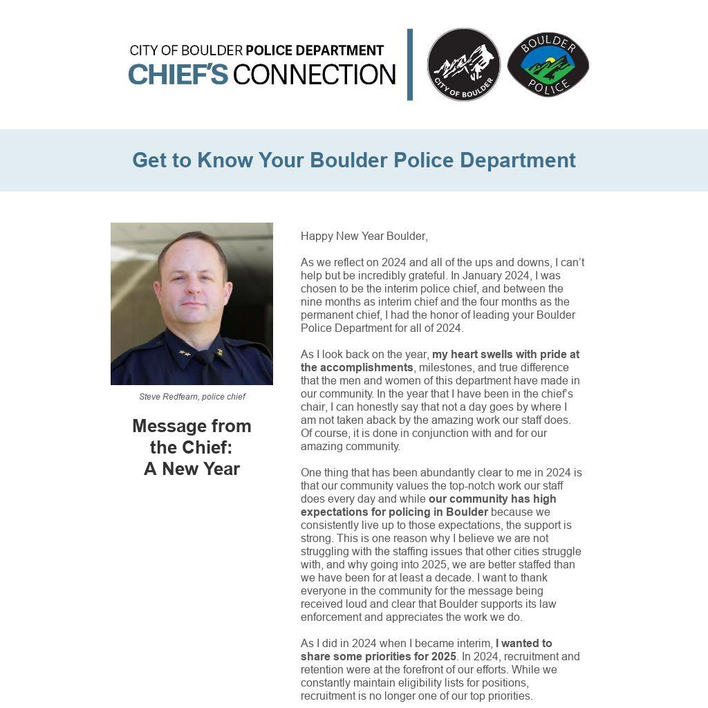 As we reflect on 2024 and all of the ups and downs, I can’t help but be incredibly grateful. In January 2024, I was chosen to be the interim police chief, and between the nine months as interim chief and the four months as the permanent chief, I had the honor of leading your Boulder Police Department for all of 2024.
