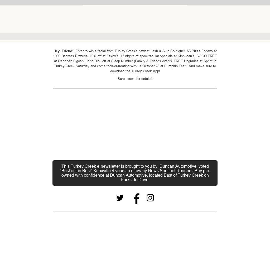 Hey  Friend!  Enter to win a facial from Turkey Creek's newest Lash & Skin Boutique!  $5 Pizza Fridays at 1000 Degrees Pizzeria, 10% off at Zaxby's, 13 nights of spooktacular specials at Kinnucan's, BOGO FREE at OshKosh B'gosh, up to 50% off at Sleep Number (Family & Friends event), FREE Upgrades at Sprint in Turkey Creek Saturday and come trick-or-treating with us October 28 at Pumpkin Fest!  And make sure to download the Turkey Creek App!