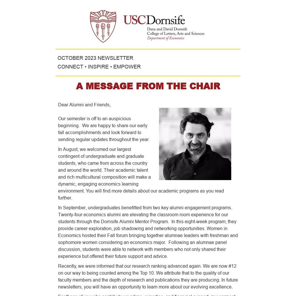 In September, undergraduates benefitted from two key alumni engagement programs. Twenty-four economics alumni are elevating the classroom room experience for our students through the Dornsife Alumni Mentor Program. In this eight-week program, they provide career exploration, job shadowing and networking opportunities. Women in Economics hosted their Fall forum bringing together alumnae leaders with freshman and sophomore women considering an economics major. Following an alumnae panel discussion, students were able to network with members who not only shared their experience but offered their future support and advice.