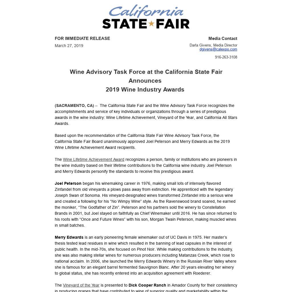 Based upon the recommendation of the California State Fair Wine Advisory Task Force, the California State Fair Board unanimously approved Joel Peterson and Merry Edwards as the 2019 Wine Lifetime Achievement Award recipients.