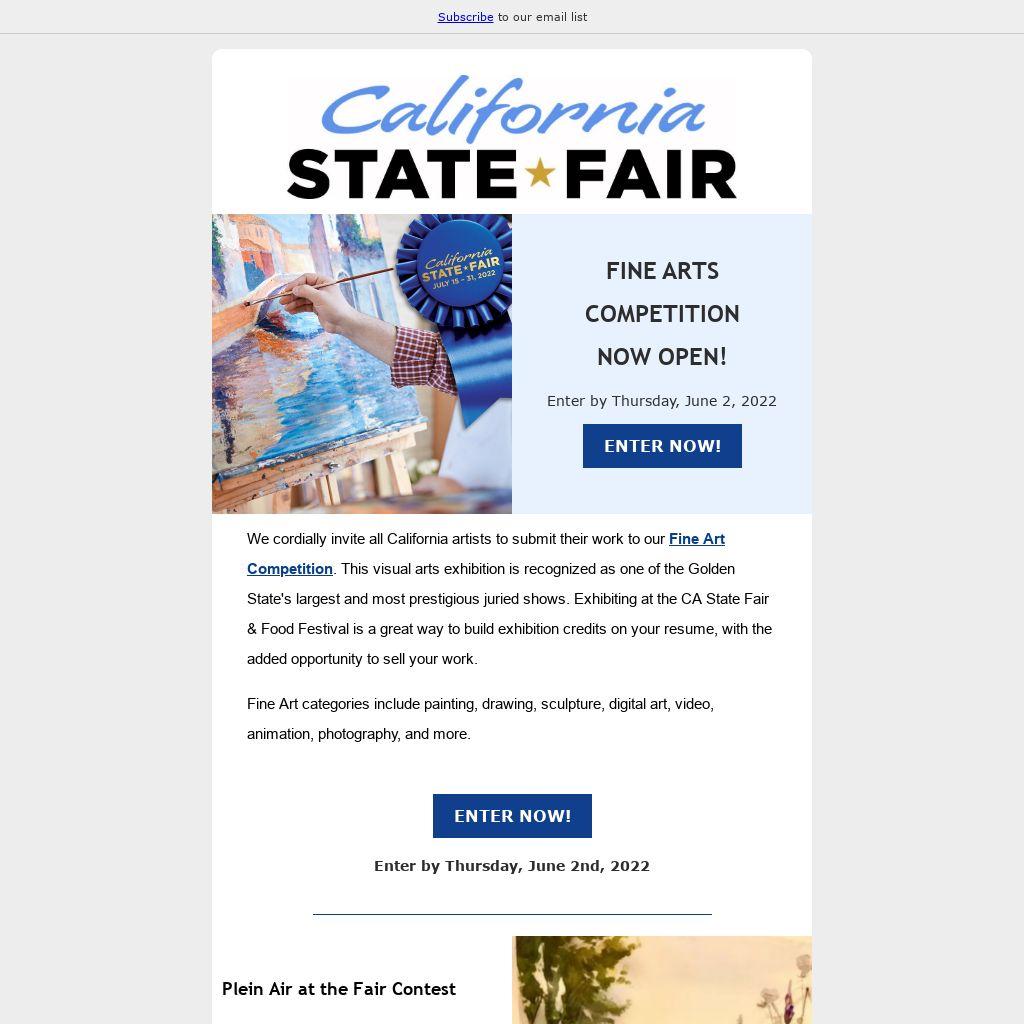 We cordially invite all California artists to submit their work to our Fine Art Competition. This visual arts exhibition is recognized as one of the Golden State's largest and most prestigious juried shows. Exhibiting at the CA State Fair & Food Festival is a great way to build exhibition credits on your resume, with the added opportunity to sell your work.