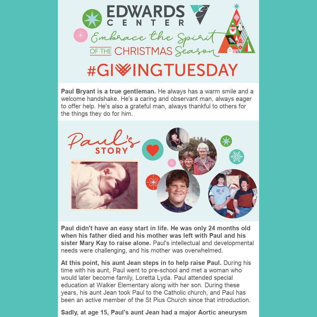 At this time of year, we are reminded that Edwards Center is not just buildings where activities occur and places where residents live, but we are a community where long-time friendships are forged, dreams are realized, and greater independence is achieved. We are incredibly proud that we are able to offer residential, vocational, and recreational supports that create a good quality of life for Paul and others like him. This holiday season we want to let you know that we are deeply grateful for the trust and support you have shown us.