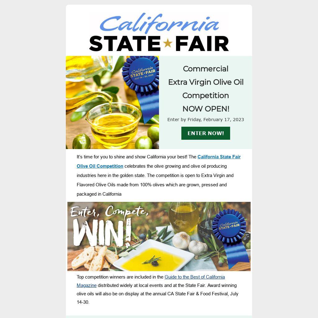 It’s time for you to shine and show California your best! The California State Fair Olive Oil Competition celebrates the olive growing and olive oil producing industries here in the golden state. The competition is open to Extra Virgin and Flavored Olive Oils made from 100% olives which are grown, pressed and packaged in California
