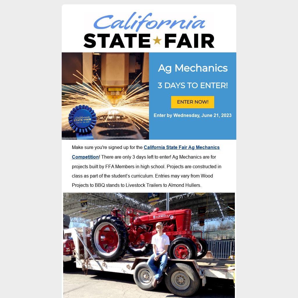 Make sure you're signed up for the California State Fair Ag Mechanics Competition! There are only 3 days left to enter! Ag Mechanics are for projects built by FFA Members in high school. Projects are constructed in class as part of the student’s curriculum. Entries may vary from Wood Projects to BBQ stands to Livestock Trailers to Almond Hullers.