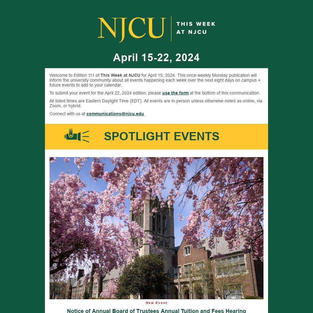 Welcome to Edition 111 of This Week at NJCU for April 15, 2024. This once-weekly Monday publication will inform the university community about all events happening each week over the next eight days on campus + future events to add to your calendar.