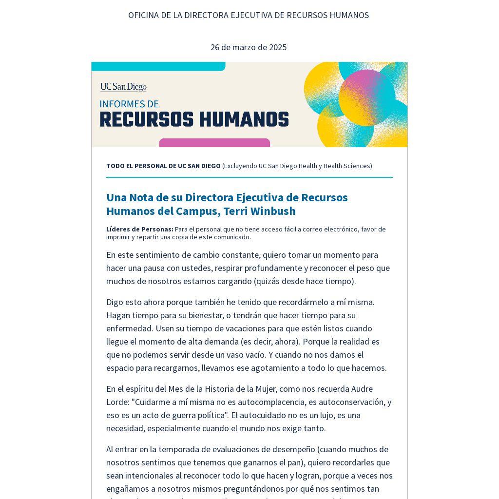 Marquen sus calendarios para el martes 13 de mayo de 10 a 11:30 a.m. y asistan a el próximo Informe Directivo, donde se abordarán las evaluaciones de desempeño del personal, así como otros temas relevantes para la comunidad de UC San Diego. ¿No pueden asistir en vivo? Una grabación estará disponible en Blink unos días después del evento. Regístrense con anticipación y envíen sus preguntas a través de Zoom.