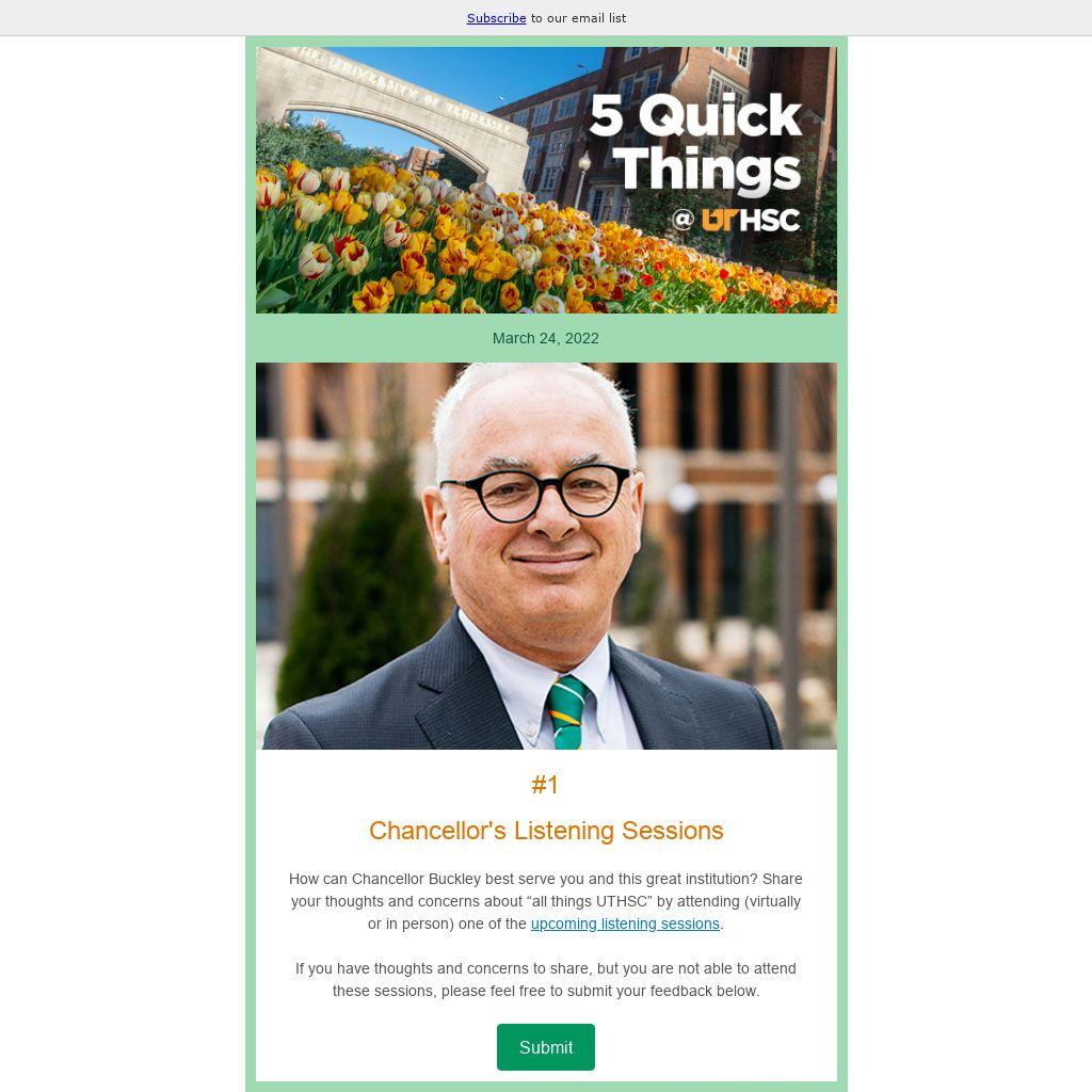 How can Chancellor Buckley best serve you and this great institution? Share your thoughts and concerns about “all things UTHSC” by attending (virtually or in person) one of the upcoming listening sessions.