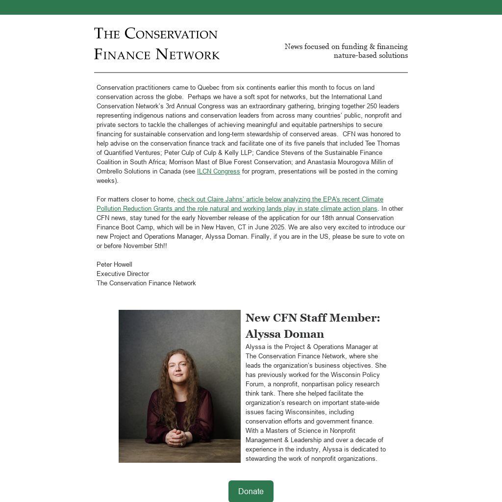 For matters closer to home, check out Claire Jahns’ article below analyzing the EPA’s recent Climate Pollution Reduction Grants and the role natural and working lands play in state climate action plans. In other CFN news, stay tuned for the early November release of the application for our 18th annual Conservation Finance Boot Camp, which will be in New Haven, CT in June 2025. We are also very excited to introduce our new Project and Operations Manager, Alyssa Doman. Finally, if you are in the US, please be sure to vote on or before November 5th!!
