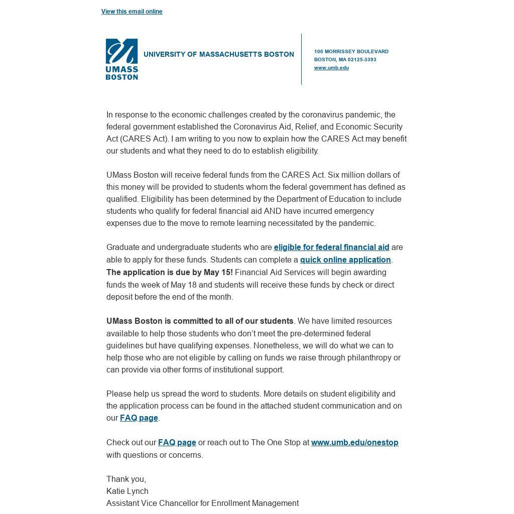 UMass Boston will receive federal funds from the CARES Act. Six million dollars of this money will be provided to students whom the federal government has defined as qualified. Eligibility has been determined by the Department of Education to include students who qualify for federal financial aid AND have incurred emergency expenses due to the move to remote learning necessitated by the pandemic.