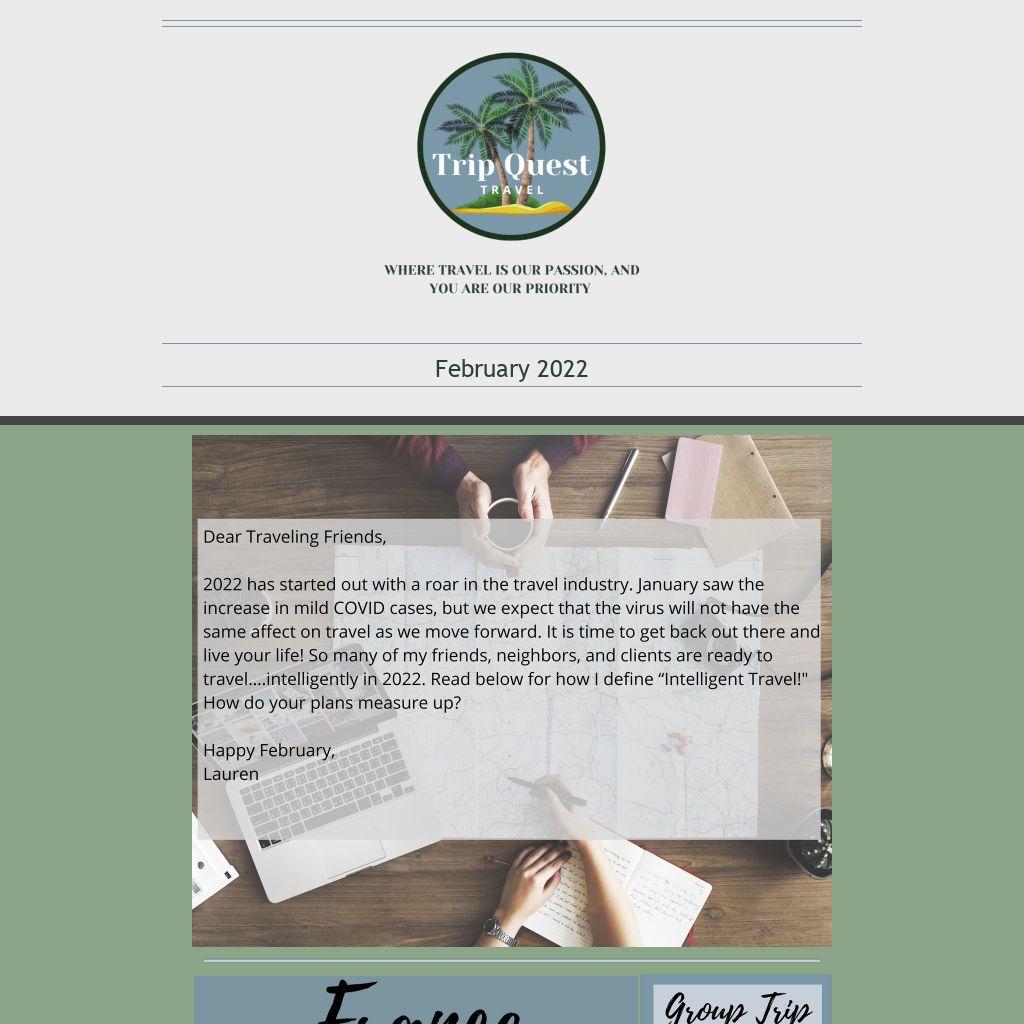 I am Lauren Williams, owner of Trip Quest Travel Services for the past seven years. Moving from three decades in education to becoming a travel consultant has caused me to shift from “The Doctor of Education” to “The Doctor of Travel.” My clients are often just like me – they want a rejuvenating vacation that teaches them about the world and the cultures around them. I love beautiful scenery, exploring new places, and learning something new every day! Aside from travel, I stay busy with my husband, Steve, and our four children and thirteen grandchildren. Being active in the church and in our community feeds our souls as well. I love to play tennis, pickleball, and bridge when I am not helping clients plan that perfect trip! Because our world is so much smaller now, I am happy to work with clients wherever they might live…but by referral only. Hope you enjoy my monthly newsletter – let me know if there is something you’d like to know more about!