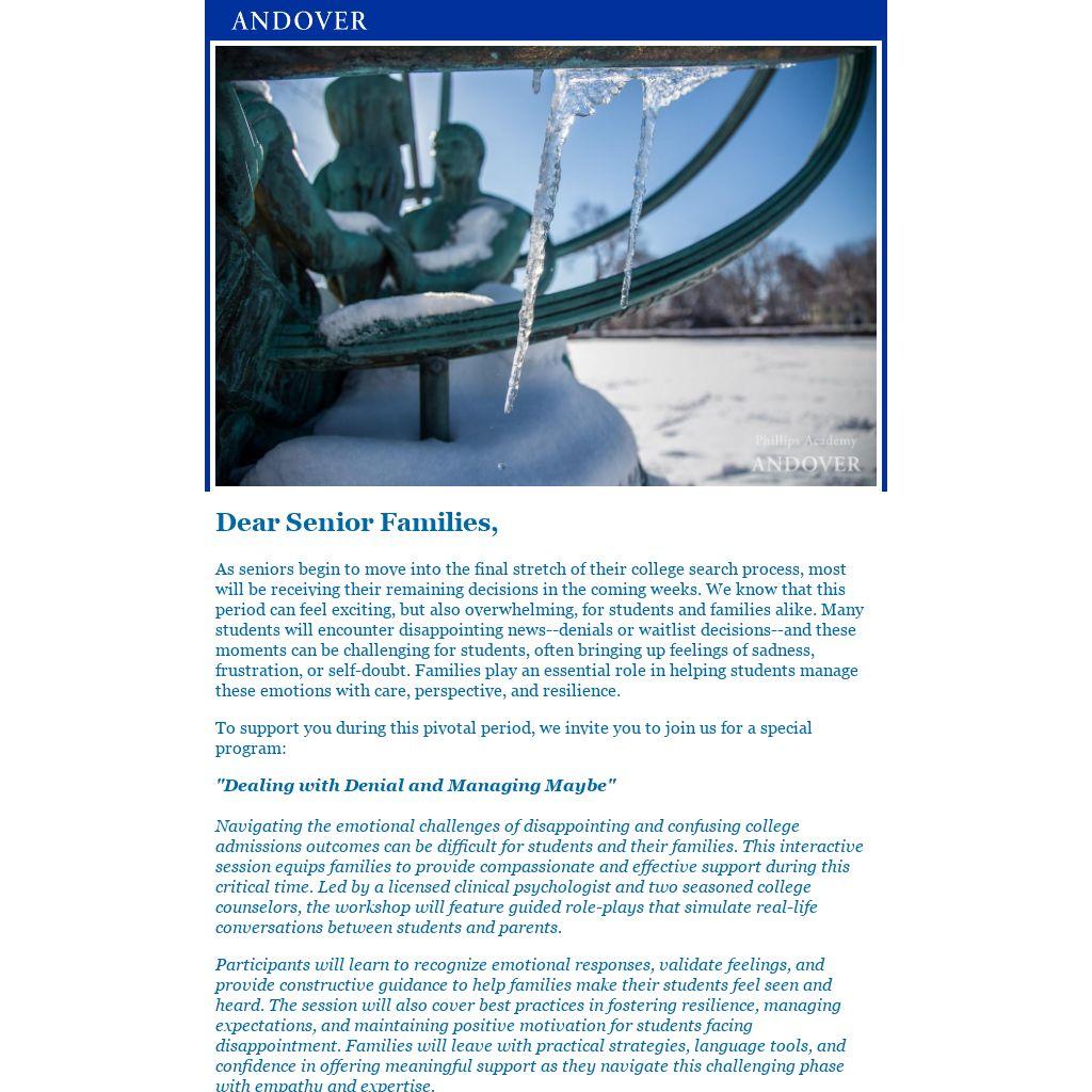As seniors begin to move into the final stretch of their college search process, most will be receiving their remaining decisions in the coming weeks. We know that this period can feel exciting, but also overwhelming, for students and families alike. Many students will encounter disappointing news--denials or waitlist decisions--and these moments can be challenging for students, often bringing up feelings of sadness, frustration, or self-doubt. Families play an essential role in helping students manage these emotions with care, perspective, and resilience.