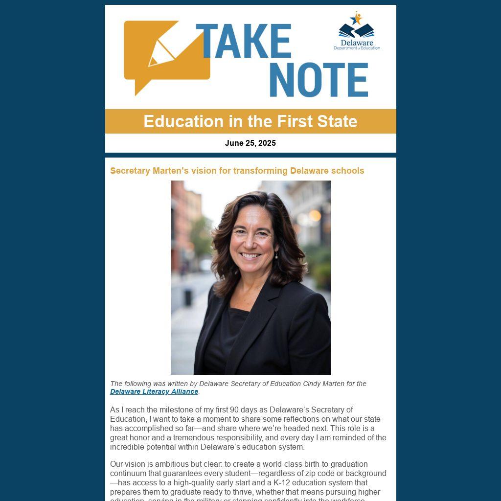 Looking ahead, my priority is to transform Delaware education as well as support districts and charters every step of the way. The journey ahead is challenging, but the momentum is strong. I am inspired every day by the dedication of Delaware’s school staff, families, and community partners. Thank you for your ongoing commitment to our students. Together, we will build a brighter future for Delaware.