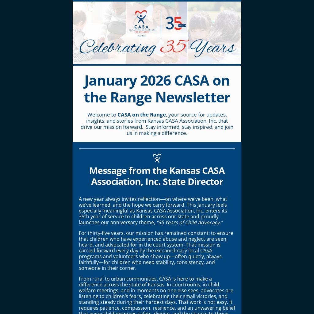 A new year always invites reflection—on where we’ve been, what we’ve learned, and the hope we carry forward. This January feels especially meaningful as Kansas CASA Association, Inc. enters its 35th year of service to children across our state and proudly launches our anniversary theme, “35 Years of Child Advocacy.”