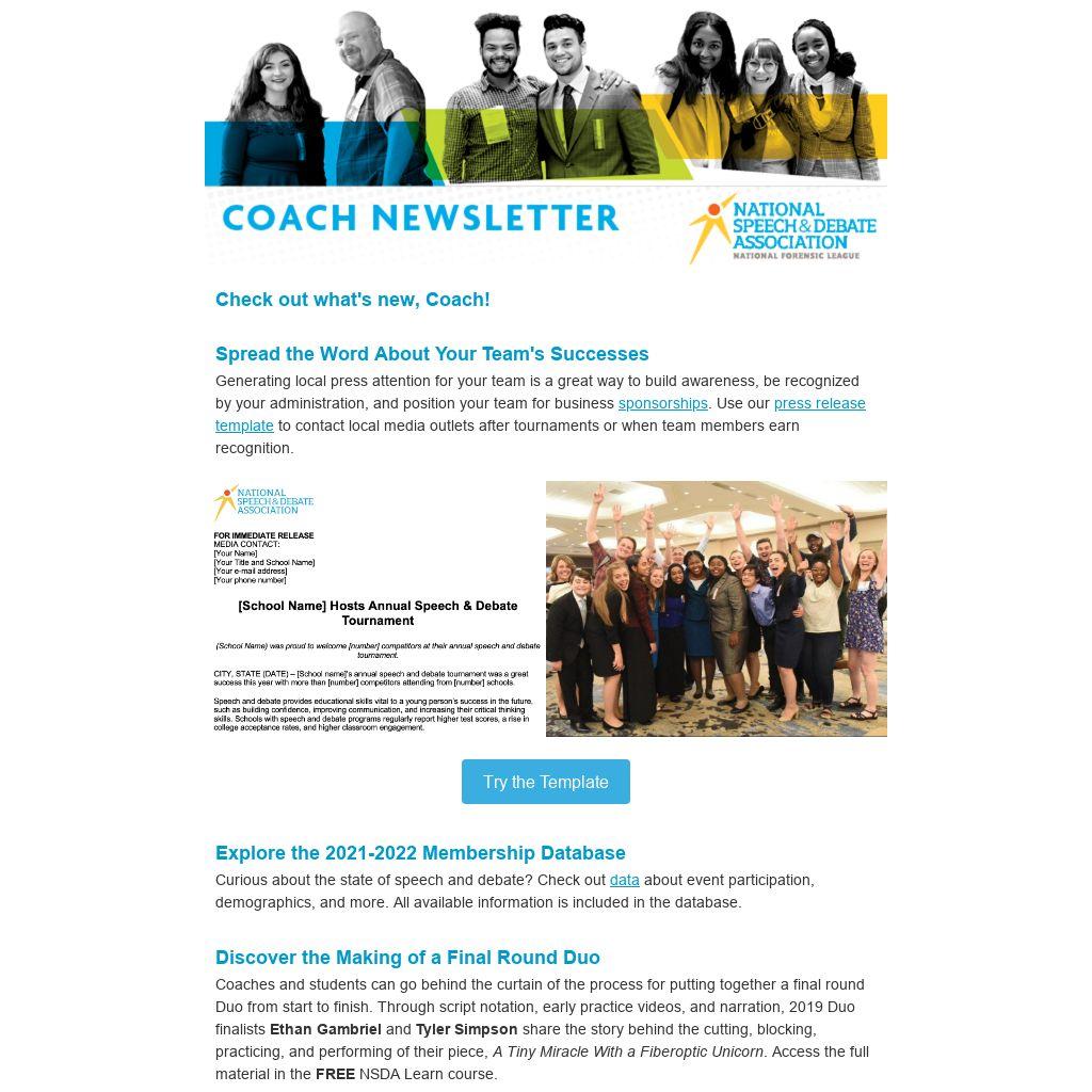 Generating local press attention for your team is a great way to build awareness, be recognized by your administration, and position your team for business sponsorships. Use our press release template to contact local media outlets after tournaments or when team members earn recognition.