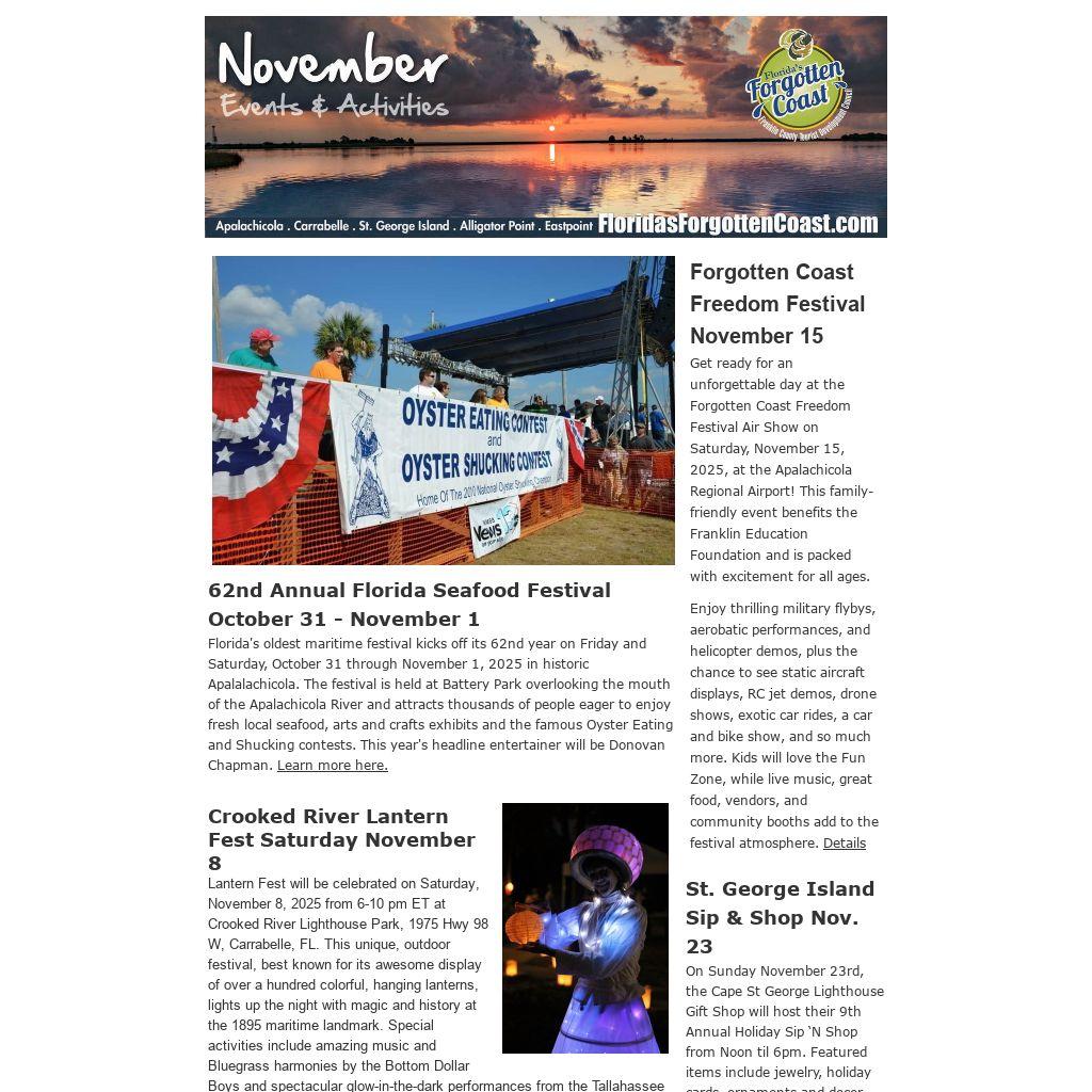 62nd Annual Florida Seafood Festival October 31 - November 1 Florida's oldest maritime festival kicks off its 62nd year on Friday and Saturday, October 31 through November 1, 2025 in historic Apalalachicola. The festival is held at Battery Park overlooking the mouth of the Apalachicola River and attracts thousands of people eager to enjoy fresh local seafood, arts and crafts exhibits and the famous Oyster Eating and Shucking contests. This year's headline entertainer will be Donovan Chapman. Learn more here.