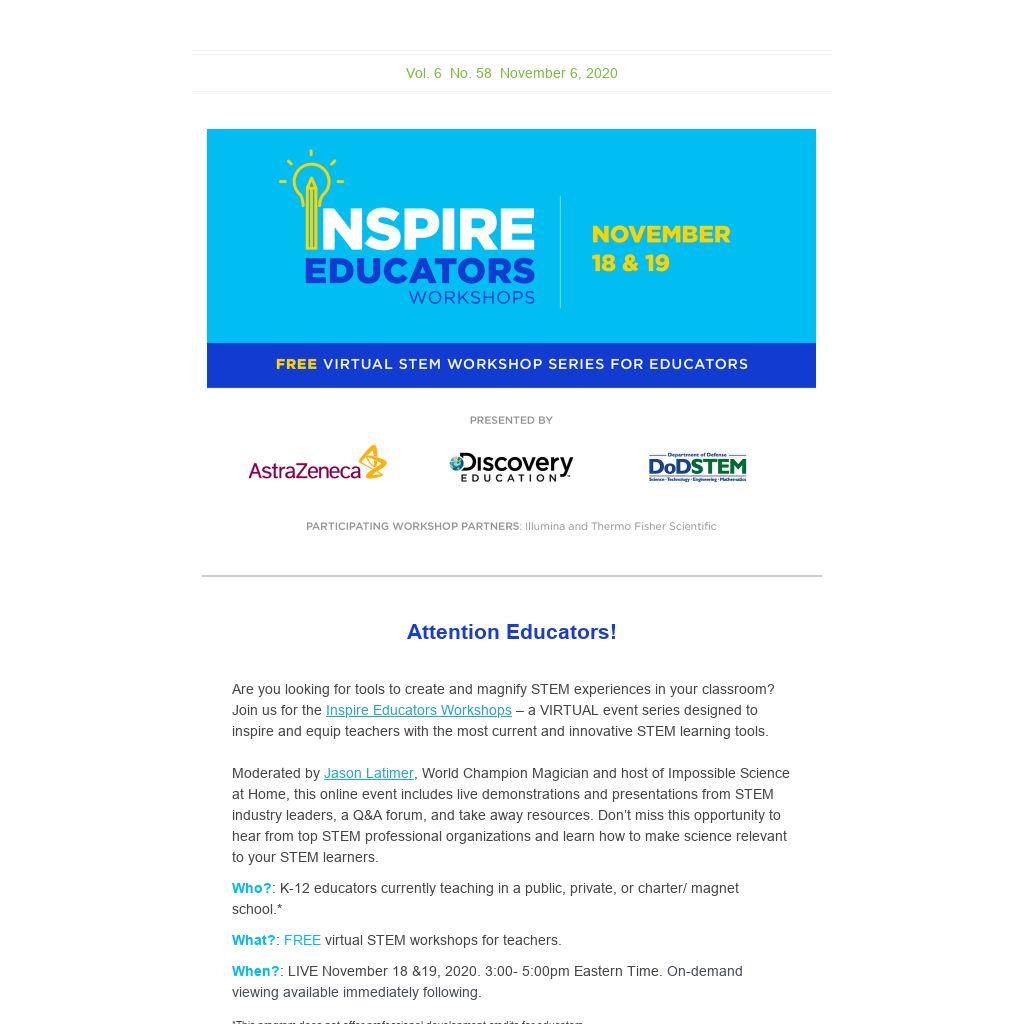 Are you looking for tools to create and magnify STEM experiences in your classroom? Join us for the Inspire Educators Workshops – a VIRTUAL event series designed to inspire and equip teachers with the most current and innovative STEM learning tools.