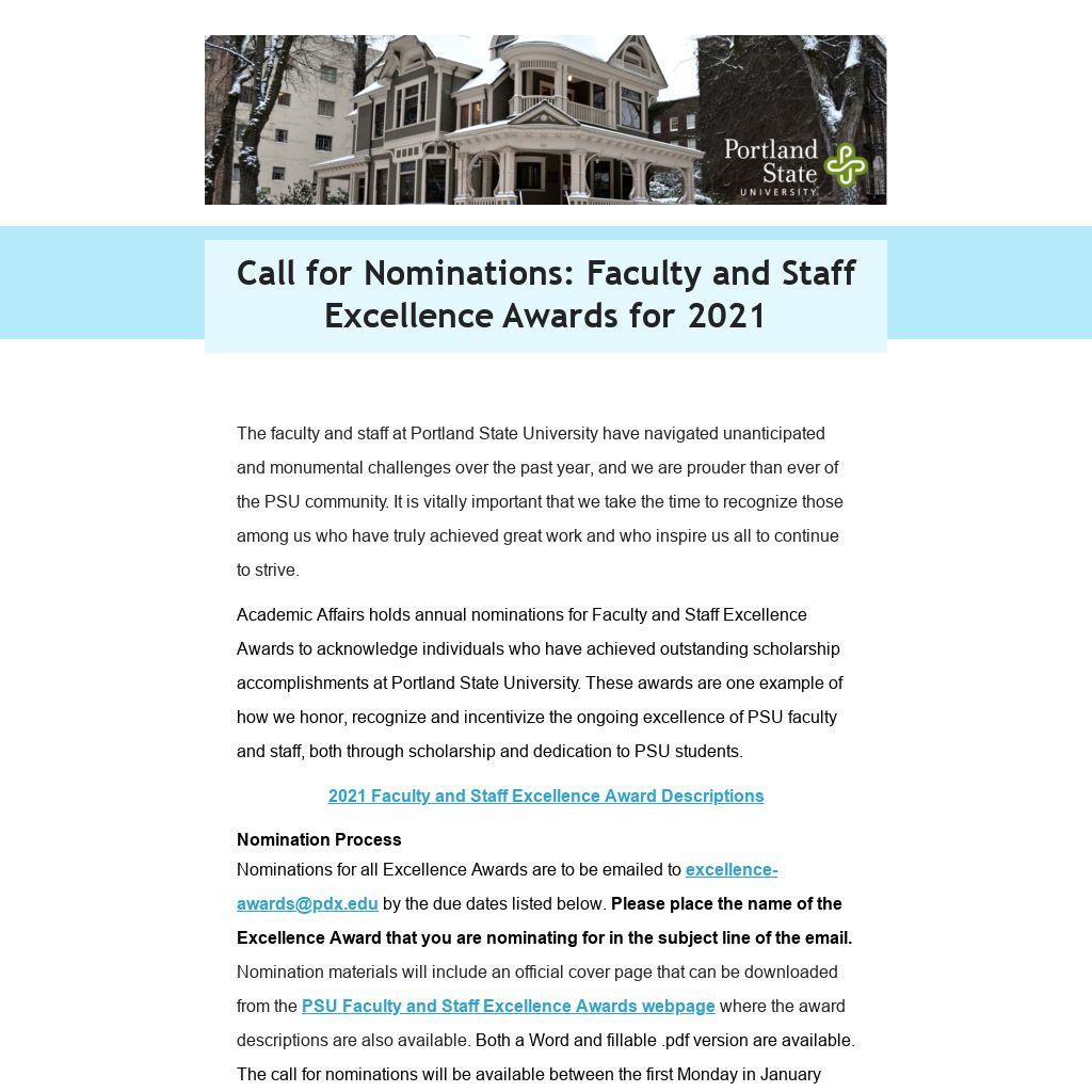 Nominations for all Excellence Awards are to be emailed to excellence-awards@pdx.edu by the due dates listed below. Please place the name of the Excellence Award that you are nominating for in the subject line of the email. Nomination materials will include an official cover page that can be downloaded from the PSU Faculty and Staff Excellence Awards webpage where the award descriptions are also available. Both a Word and fillable .pdf version are available. The call for nominations will be available between the first Monday in January (January 4, 2021) and the second Friday in February (February 12, 2021). All completed applications submitted by the second Friday in February (February 12, 2021) will be considered eligible for review.