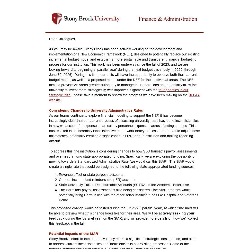 As you may be aware, Stony Brook has been actively working on the development and implementation of a New Economic Framework (NEF), designed to potentially replace our existing incremental budget model and establish a more sustainable and transparent financial budgeting process for our institution. This work has been underway since the fall of 2023, and we are looking forward to beginning a ‘parallel year’ during the next budget cycle (July 1, 2025, through June 30, 2026). During this time, our units will have the opportunity to observe both their current budget model, as well as a proposed model under the NEF for their individual areas. The NEF aims to provide VP Areas greater autonomy to manage their operations and potentially allow the university to invest more strategically, with improved alignment with the four priorities in our Strategic Plan. Please take a moment to review the progress we have been making on the BFP&A website.
