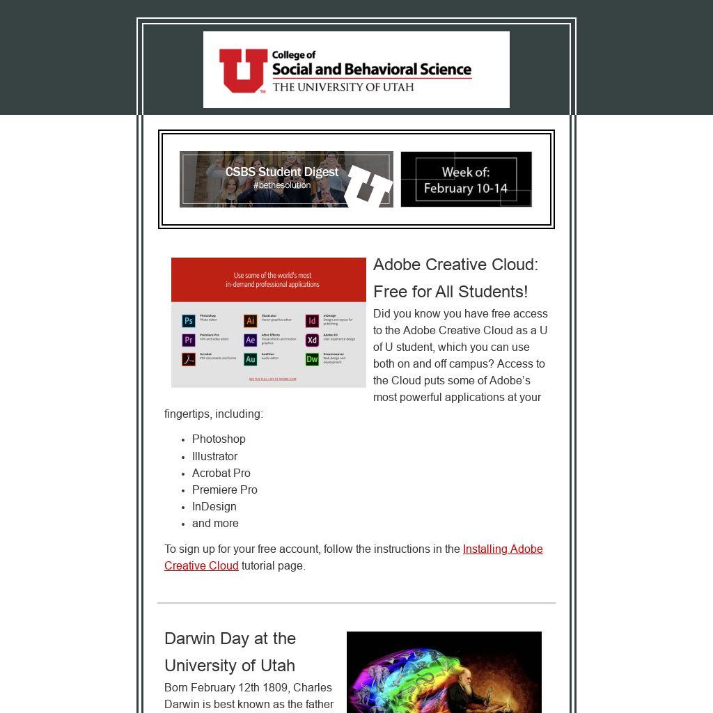 Did you know you have free access to the Adobe Creative Cloud as a U of U student, which you can use both on and off campus? Access to the Cloud puts some of Adobe’s most powerful applications at your fingertips, including: