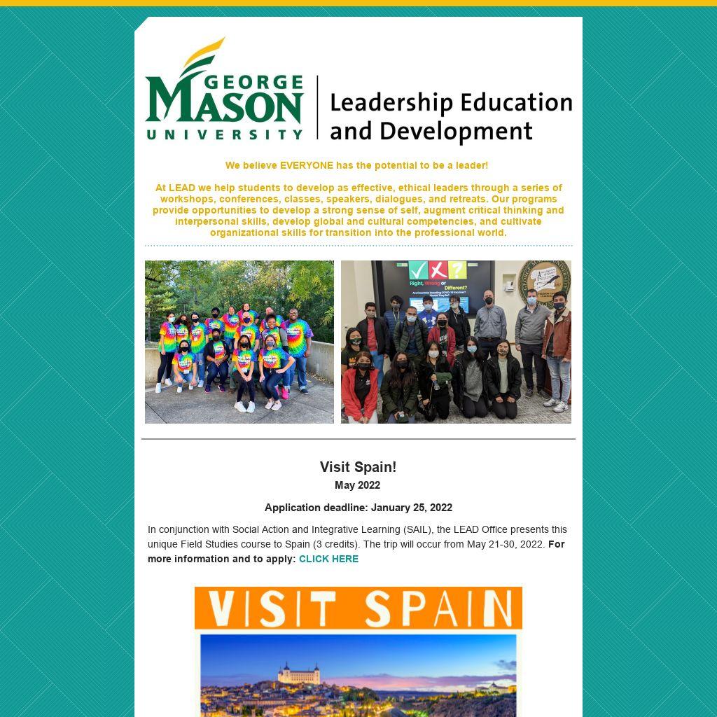 The LEAD Office invites all members of the Mason community to our virtual panel of Mason Alumni for the first instalment of the Alumni Leadership Speaker Series in the Spring semester. The alumni will be talking about their personal leadership experiences when they were students at Mason as well as their participation in internships, practicum experiences, and much more. The event will serve as a great opportunity to understand how leadership skills can be developed and applied in any internship role as the alumni panel share their knowledge and advice to succeed. RSVP: HERE.