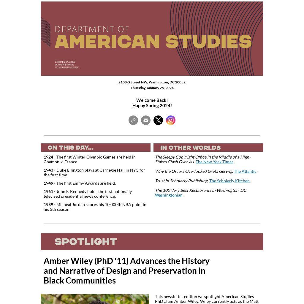 This newsletter edition we spotlight American Studies PhD alum Amber Wiley. Wiley currently acts as the Matt and Erika Nord Director of the Center for the Preservation of Civil Rights Sites (CPCRS) and is a Presidential Associate Professor in Historic Preservation at the University of Pennsylvania's Stuart Weitzman School of Design. Amber has dedicated her professional career to advancing the history and narrative of design and preservation in Black communities as well as advocating for theoretically rigorous, thoughtful, and inclusive expansions of preservation policy and practice.