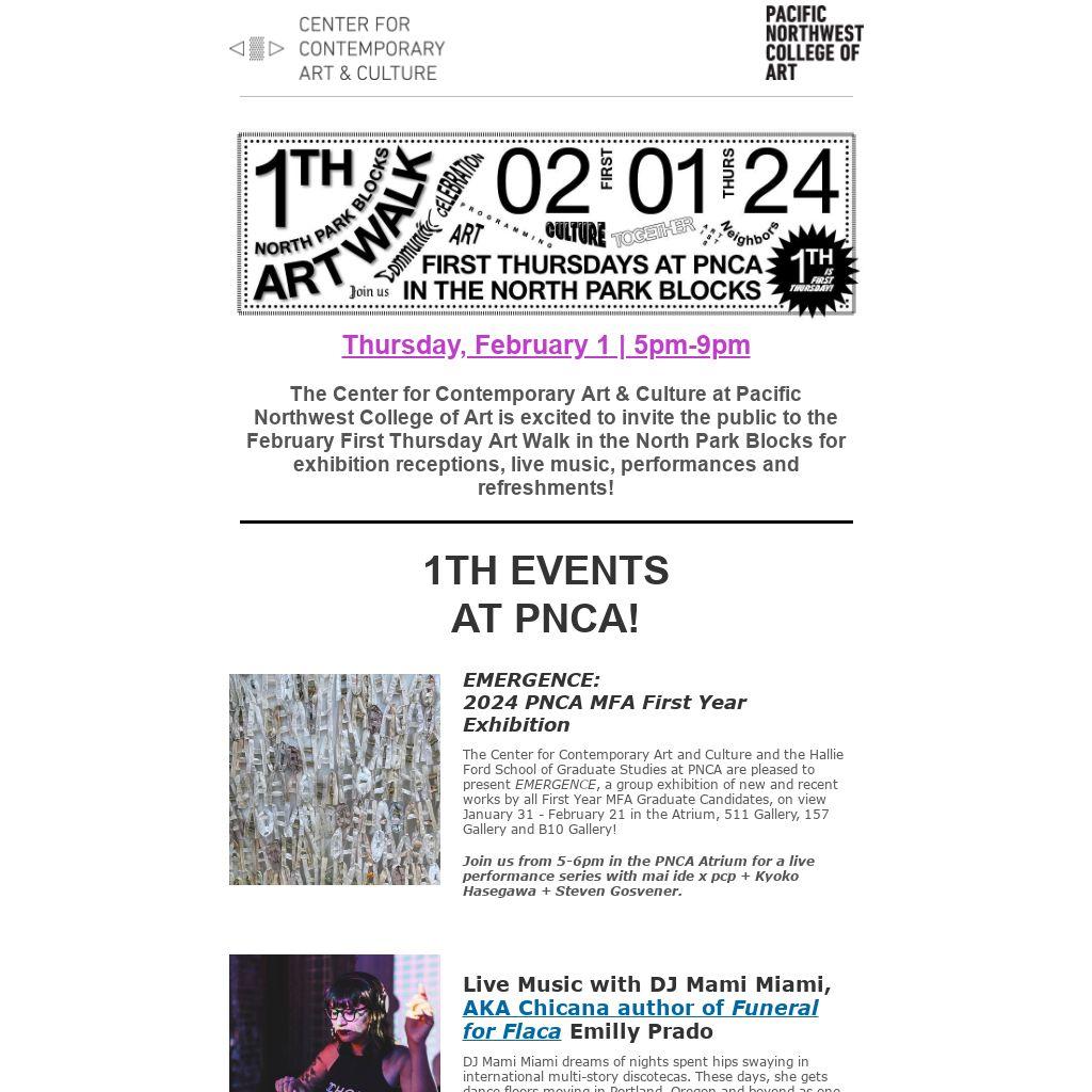 The Center for Contemporary Art & Culture at Pacific Northwest College of Art is excited to invite the public to the February First Thursday Art Walk in the North Park Blocks for exhibition receptions, live music, performances and refreshments!