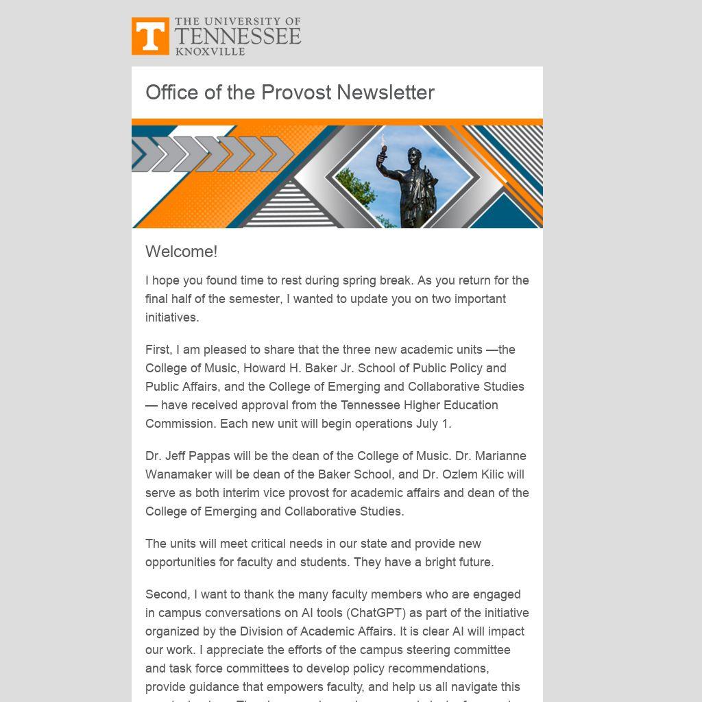 First, I am pleased to share that the three new academic units —the College of Music, Howard H. Baker Jr. School of Public Policy and Public Affairs, and the College of Emerging and Collaborative Studies — have received approval from the Tennessee Higher Education Commission. Each new unit will begin operations July 1.