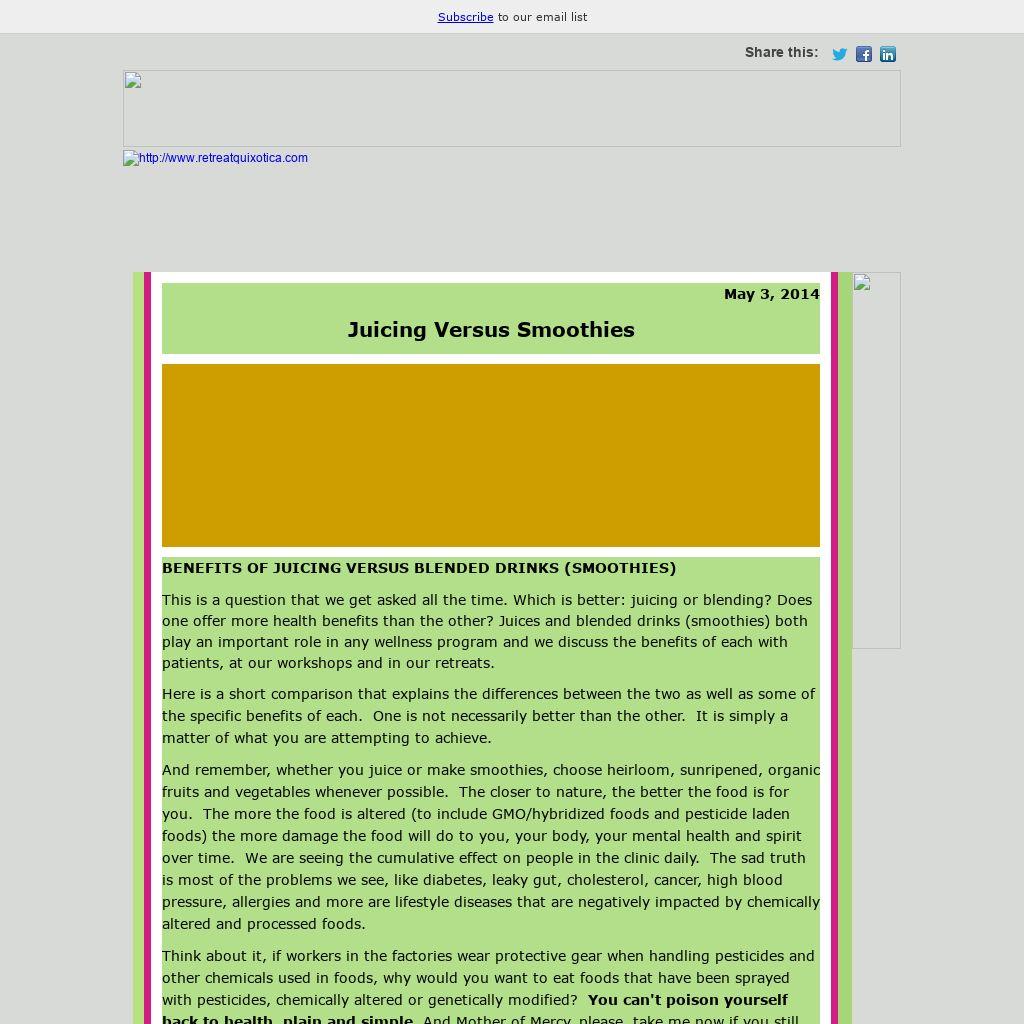 | BENEFITS OF JUICING VERSUS BLENDED DRINKS (SMOOTHIES) This is a question that we get asked all the time. Which is better: juicing or blending? Does one offer more health benefits than the other? Juices and blended drinks (smoothies) both play an important role in any wellness program and we discuss the benefits of each with patients, at our workshops and in our retreats. Here is a short comparison that explains the differences between the two as well as some of the specific benefits of each. One is not necessarily better than the other. It is simply a matter of what you are attempting to achieve. And remember, whether you juice or make smoothies, choose heirloom, sunripened, organic fruits and vegetables whenever possible. The closer to nature, the better the food is for you. The more the food is altered (to include GMO/hybridized foods and pesticide laden foods) the more damage the food will do to you, your body, your mental health and spirit over time. We are seeing the cumulative effect on people in the clinic daily. The sad truth is most of the problems we see, like diabetes, leaky gut, cholesterol, cancer, high blood pressure, allergies and more are lifestyle diseases that are negatively impacted by chemically altered and processed foods. Think about it, if workers in the factories wear protective gear when handling pesticides and other chemicals used in foods, why would you want to eat foods that have been sprayed with pesticides, chemically altered or genetically modified? You can't poison yourself back to health, plain and simple. And Mother of Mercy, please, take me now if you still can't figure that one out. In the end, those few pennies you thought you saved in cost will come back to bite you BIG TIME in medical bills....and unfortunately sometimes one's life. So please, think twice. Eat fresh, organic, non-gmo food whenever possible. Now let's get back to juicing versus smoothies.