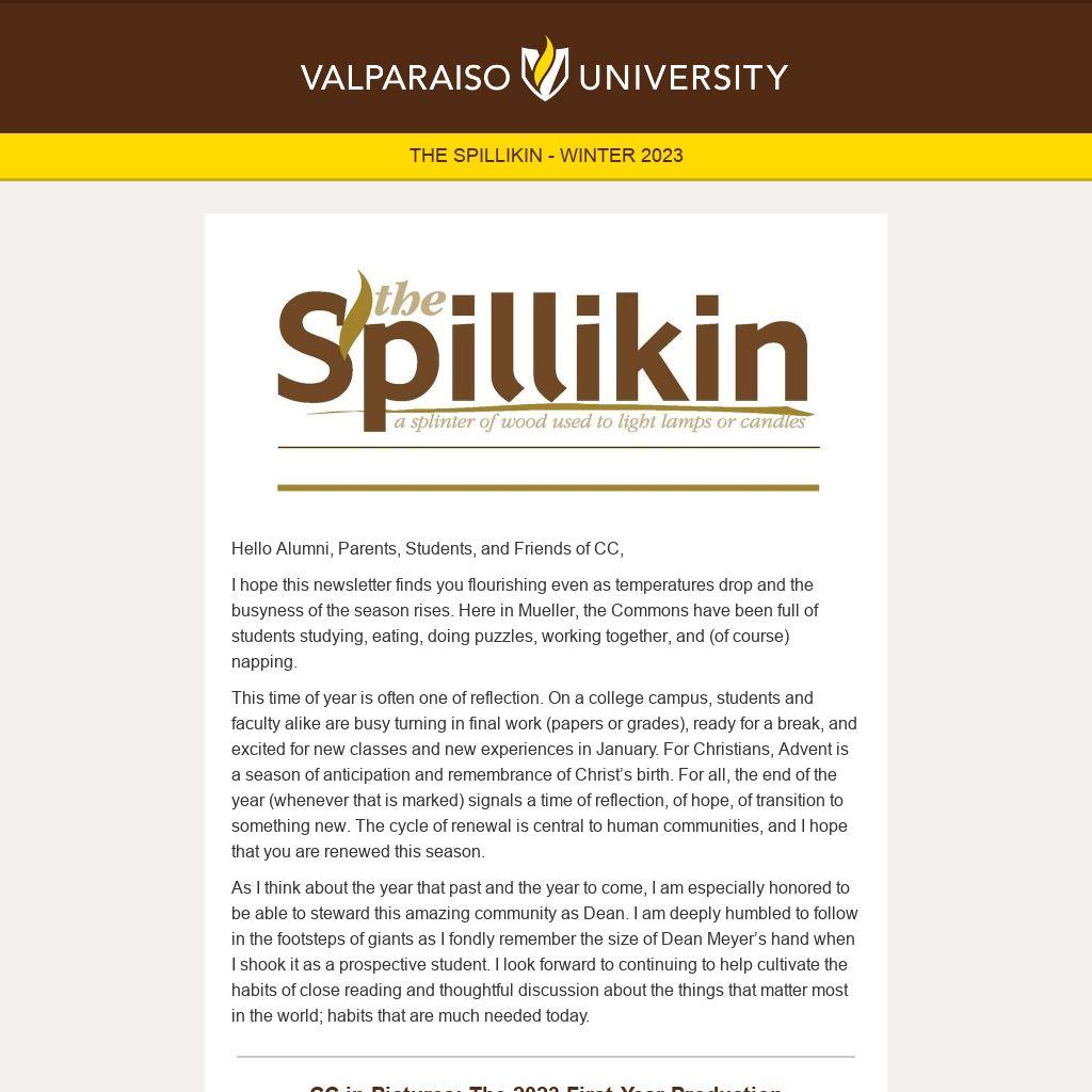 If you have news you would like to share with the larger CC community or ideas for connecting with CC, current students, or alumni, don’t hesitate to reach out to us at christ.college@valpo.edu.