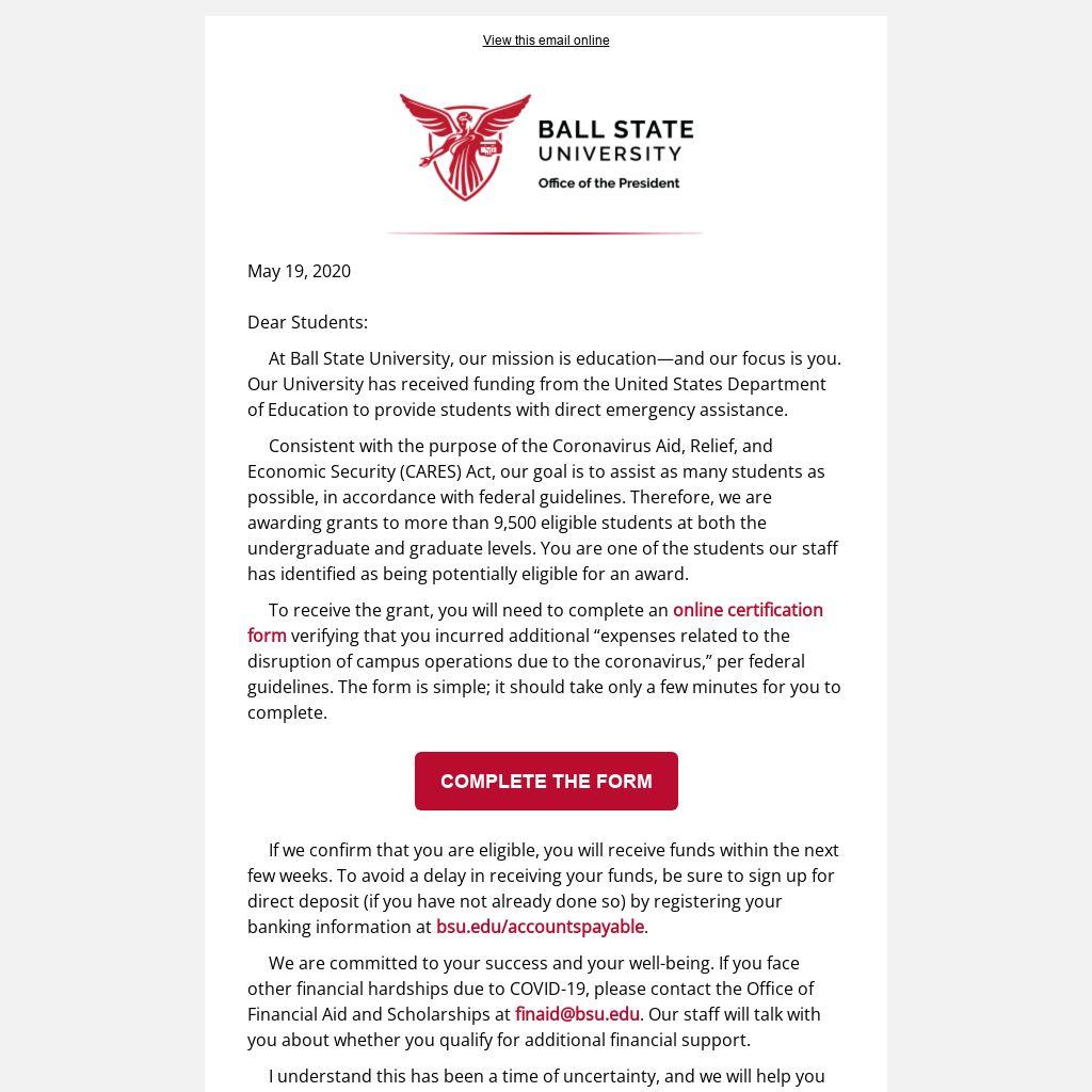 At Ball State University, our mission is education—and our focus is you. Our University has received funding from the United States Department of Education to provide students with direct emergency assistance.