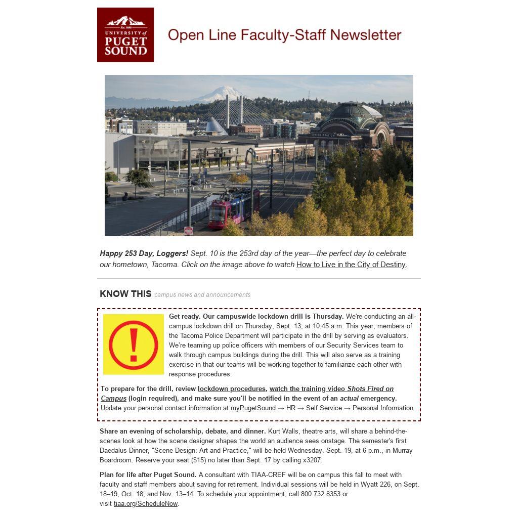 Open Line moves to myPugetSound Look for a new weekly e-newsletter, The Hatchet, in your inbox next Monday. Sent to all students, faculty, and staff, as well as Logger alumni and parents, each issue of The Hatchet will include five “top things” to look for in the coming week, along with upcoming events, news, stories, and fun facts—all in a cool, easy-to-read format. This means we’re discontinuing Open Line and moving university business announcements, such as updates about benefits, department news, campus reminders, etc., to myPugetSound. Beginning today, when you log in to myPugetSound, you’ll see news, announcements, and “Be Proud” shoutouts right there, in the same place you approve your time sheet, check your department budget, and register your vehicle! What does this mean for you? Two main things are changing: - Where to send your news and announcements: mypsnews@pugetsound.edu. Anything that you would have sent to Open Line should now go to the myPugetSound News email address.