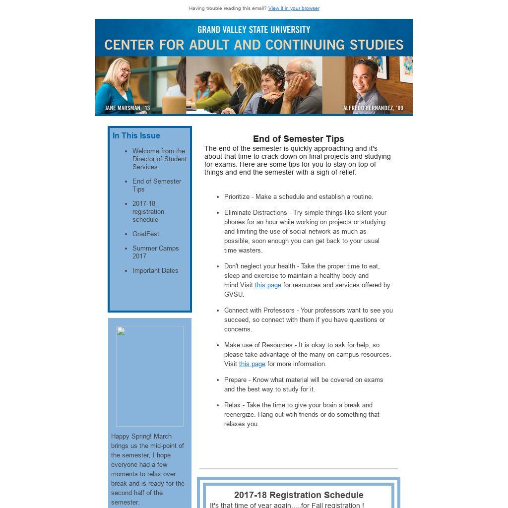 It’s hard to believe, but we are busy working on getting everything ready for next year. The schedule is already out to view and you’ll be able to register soon. If you haven’t yet, give your advisor a call or set up an appointment to discuss what you want to take. Make sure that you are set to register for your courses as soon as registration opens.