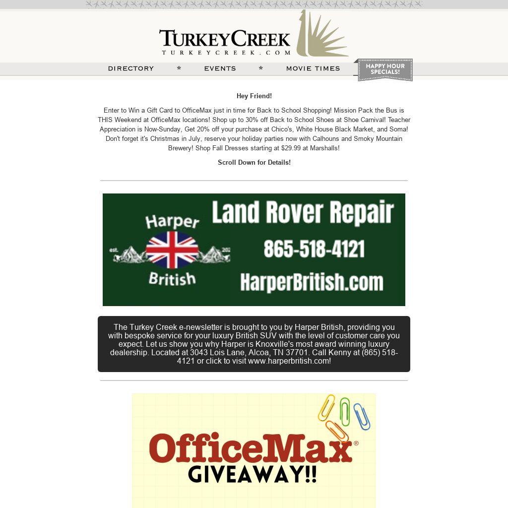 Enter to Win a Gift Card to OfficeMax just in time for Back to School Shopping! Mission Pack the Bus is THIS Weekend at OfficeMax locations! Shop up to 30% off Back to School Shoes at Shoe Carnival! Teacher Appreciation is Now-Sunday, Get 20% off your purchase at Chico's, White House Black Market, and Soma! Don't forget it's Christmas in July, reserve your holiday parties now with Calhouns and Smoky Mountain Brewery! Shop Fall Dresses starting at $29.99 at Marshalls!