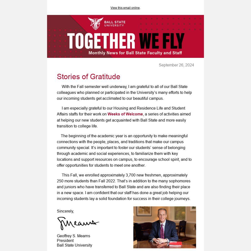 With the Fall semester well underway, I am grateful to all of our Ball State colleagues who planned or participated in the University’s many efforts to help our incoming students get acclimated to our beautiful campus.